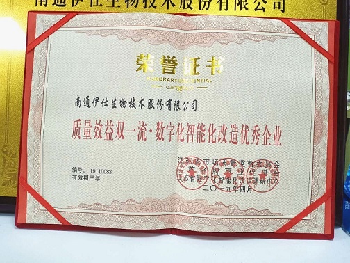 經(jīng)江蘇省市場質(zhì)量監(jiān)督委員會、江蘇省數(shù)字化智能化改造調(diào)研中心、江蘇名牌事業(yè)促進會綜合調(diào)查審核評議,南通伊仕生物技術(shù)股份有限公司符合江蘇省質(zhì)量效益雙一流·創(chuàng)新驅(qū)動轉(zhuǎn)型升級優(yōu)秀企業(yè)的條件,被評為《江蘇省質(zhì)量效益雙一流·創(chuàng)新驅(qū)動轉(zhuǎn)型升級優(yōu)秀企業(yè)》。