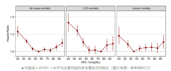 在校正潛在混雜因素后,研究者觀察到HDL-C與全因死亡率、CVD死亡率和癌癥死亡率呈U形相關(guān)。在HDL-C水平為50 mg/dL~79 mg/dL組中,全因和CVD死亡率風險最低。HDL-C水平為40 mg/dL~49 mg/dL組的癌癥死亡率最低。與參考水平50 mg/dL~59 mg/dL相比,HDL-C<30 mg/dL的受試者比極高HDL-C水平(>90 mg/dL)的受試者具有相對更高的全因死亡風險(HR 1.23,95% CI:1.17~1.29 vs. HR 1.10,95% CI:1.05~1.15)。