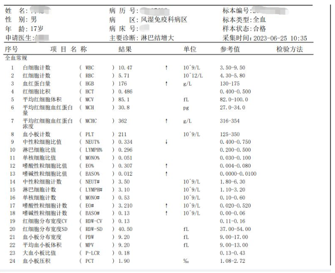 骨髓細(xì)胞學(xué)意見(jiàn):骨髓增生活躍,嗜酸性粒細(xì)胞增高,可見(jiàn)分類(lèi)不明細(xì)胞,請(qǐng)結(jié)合臨床,骨髓細(xì)胞學(xué)檢查初步排除淋巴瘤骨髓浸潤(rùn)及血液病可能?;颊叩氖人嵝粤<?xì)胞升高與全身淋巴結(jié)腫大有必然的聯(lián)系么?當(dāng)患者出院后,查閱了患者的相關(guān)實(shí)驗(yàn)檢查,見(jiàn)圖4: